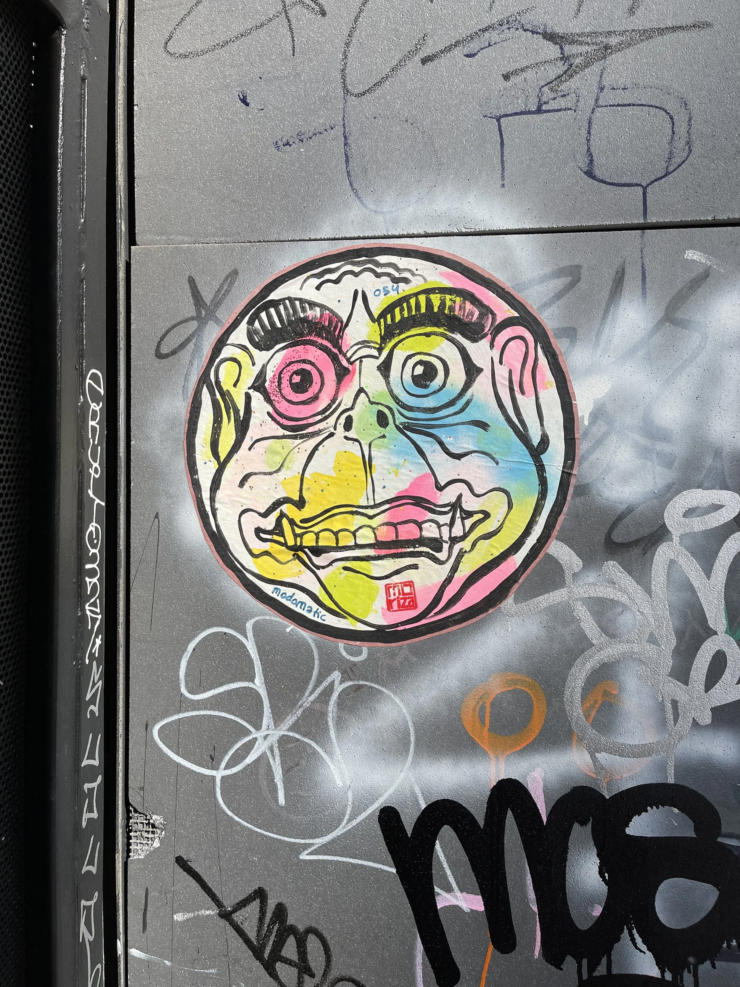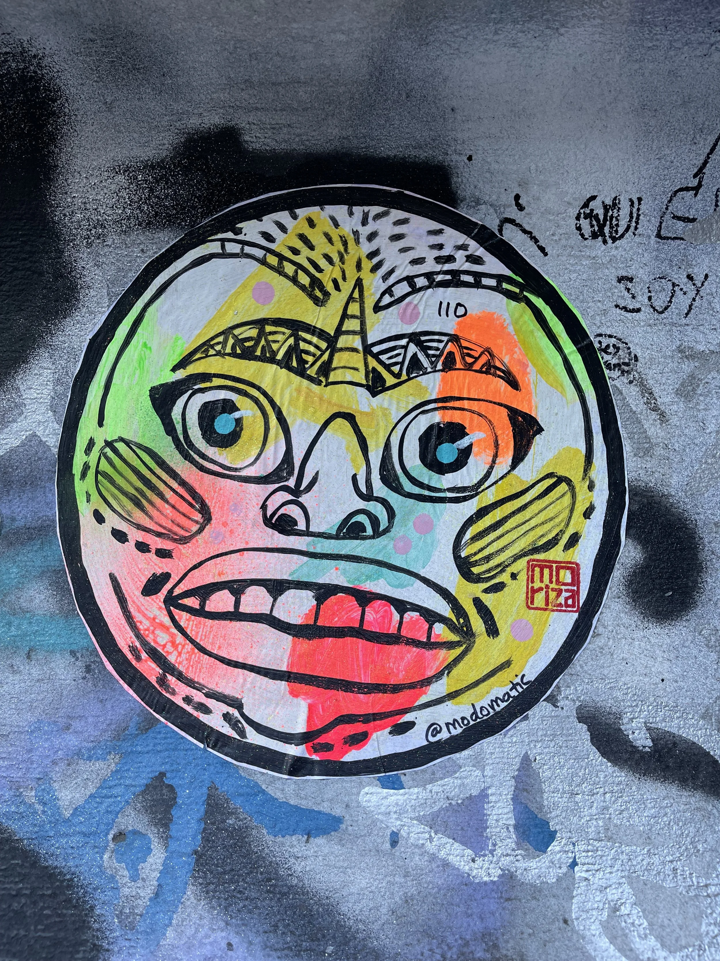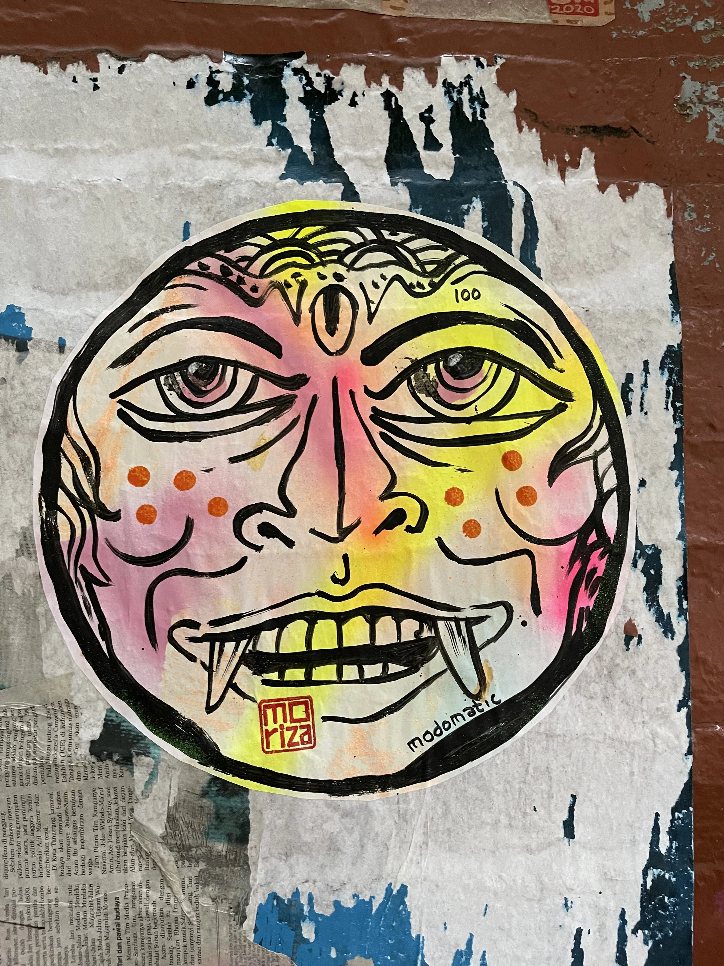 Modomatic’s Guarding Faces with unsleepy eyes. Barong, Kirtimukha, and Drishti Gombe reborn as wild, round, neon faces wheat-pasted across downtown streets. They stare, they swallow evil, they never blink.